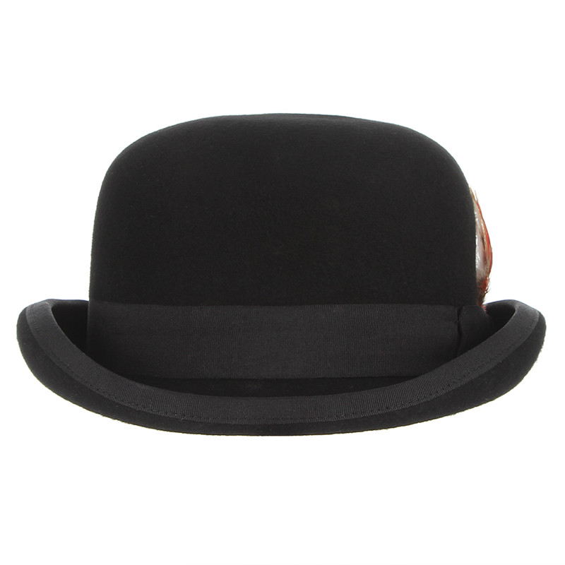 Le design classique de ce chapeau melon est rehaussé par une bande en gros-grain et une plume colorée, apportant une note de raffinement et de distinction.