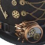 Les lunettes Steampunk intégrées avec leurs pointes agressives ajoutent une dimension dramatique et futuriste à l’ensemble. Les accents dorés contrastent magnifiquement avec le noir du chapeau, créant un look à la fois élégant et intimidant.